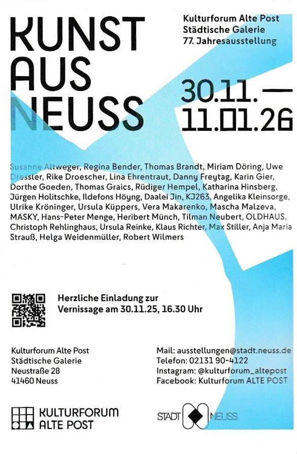 30.11.2025 – 11.01.2026 „Kunst aus Neuss“ Kulturforum Alte Post – Jahresausstellung mit Künstlern des Kunst.NeussVernissage: 30. November 2025, 16.30 Uhr Öffnungszeiten: täglich geöffnetsiehe AushangAusstellungsort: Kulturforum Alte PostStädtische GalerieNeustr. 2841460 Neuss Einladung Beitrag veröffentlicht:13. November 2025 Beitrags-Kategorie:Aktivitäten Schlagwörter: 2025, Alte Post, Ausstellung, Jahresausstellung, Kunst.Neuss, Neuss Weitere Artikel ansehen Vorheriger BeitragVIVA – Renate Linnemeier im Bürgerhaus Angermund Nächster BeitragARTVENT25 – mit Künstlern des Kunst.Neuss Das könnte dir auch gefallen Die Pop-Up-Galerie wird weiter von unseren Mitgliedern genutzt 16. September 2021 Amédé Ackermann in New York 15. Dezember 2023 Durch die Ausstellung – „Bei Anruf Kunst“ 29. März 2021