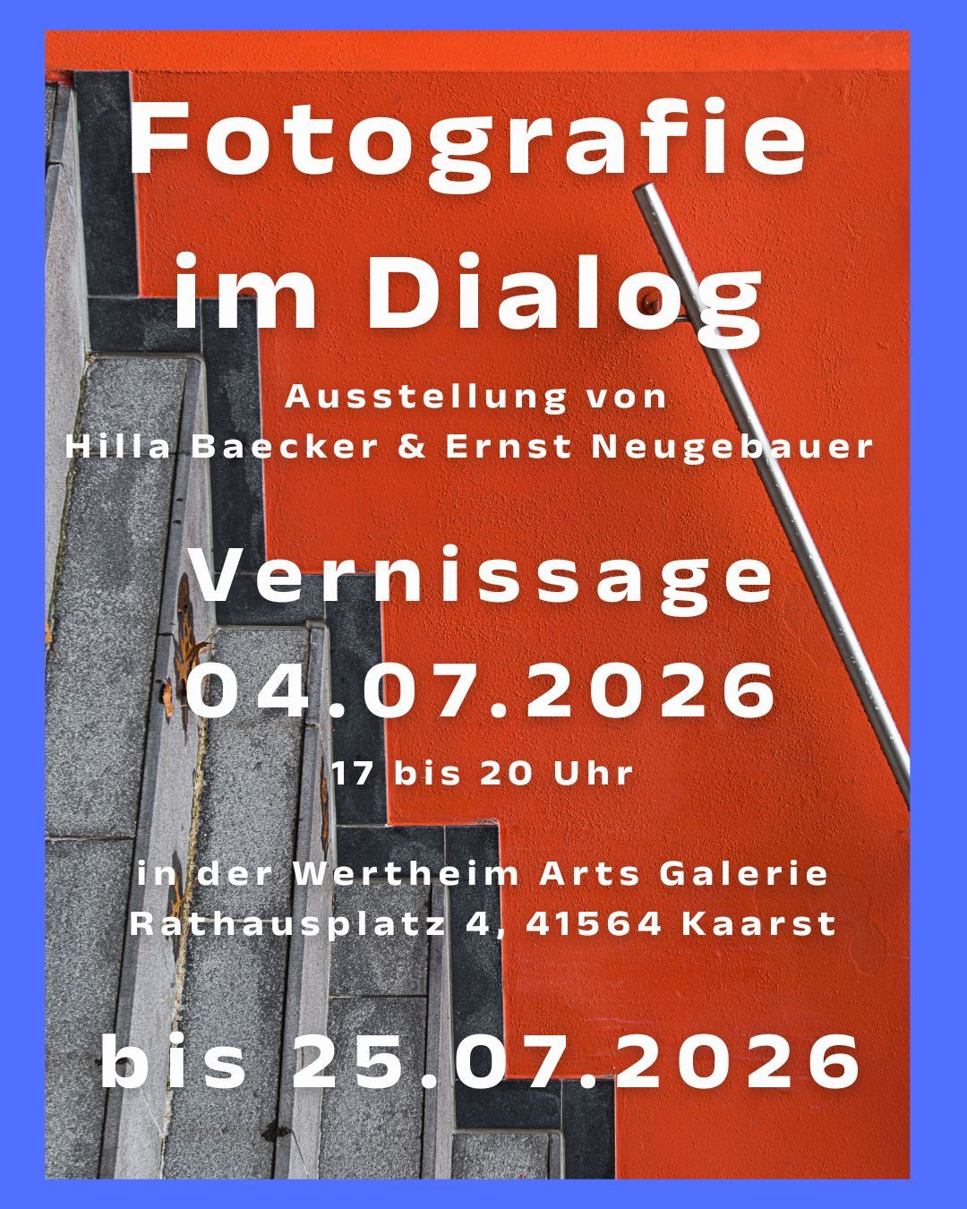 04.07.2026 – 25.07.2026 „Fotografie im Dialog“ Ausstellung von Hilla Baecker und Ernst Neugebauer. Vernissage: 04. Juli 2026, 17 – 20 Uhr Ausstellungsort: Wertheim Arts GalerieRathausplatz 441564 Kaarst-Büttgen Einladung Beitrag veröffentlicht:24. April 2026 Beitrags-Kategorie:Aktivitäten Schlagwörter: 2026, Ausstellung, Ernst Neugebauer, Hilla Baecker, Kaarst-Büttgen, Wertheim Arts Galerie Weitere Artikel ansehen Vorheriger Beitrag„In unseren Augen“, Amédé Ackermann in Kaarst-Büttgen Das könnte dir auch gefallen Impressionen zur Ausstellung Potentiale 28. Januar 2019 „Ist das Kunst oder kann das weg?” in Zons 8. Mai 2024 Landpartie 29. Juni 2018